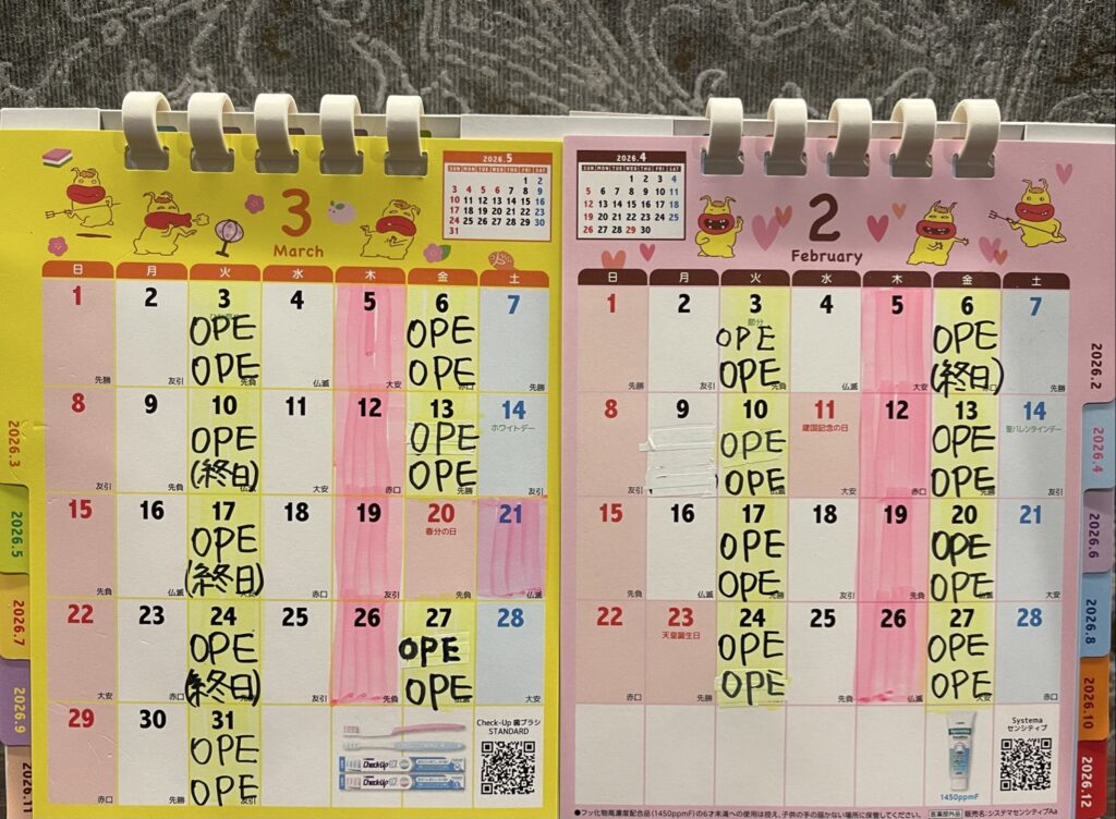 カレンダー内に【オペ終日】と記載された日は、上下顎オールオン4や、多数歯埋入を伴う難症例を中心に予定しております。片顎のオールオン4であれば半日で終了する場合もございます。